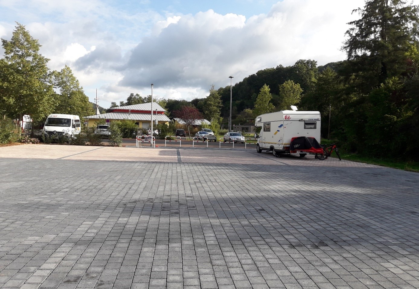 - vier Stellplätze für große Wohnmobile (ca. 10 m x 5 m) mit direktem Stromanschluss