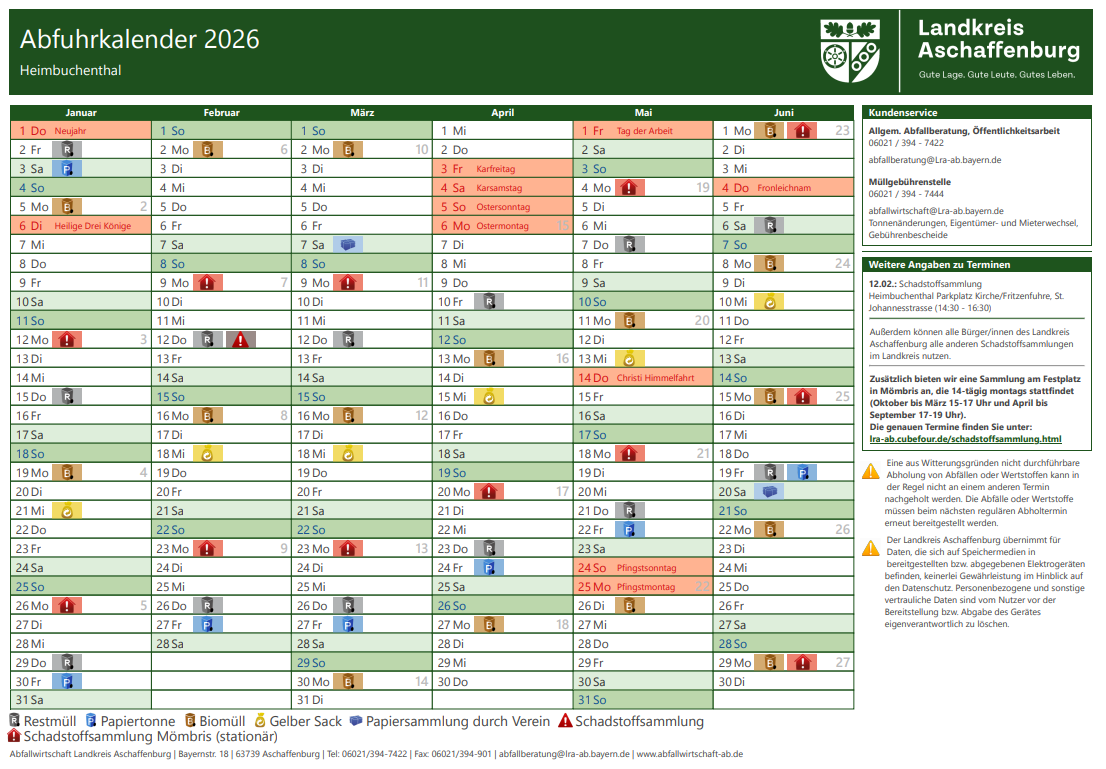 Gerne könne Sie auch die Online-Version des Landratsamtes Aschaffenburg unter Abfuhrkalender - Abfallwirtschaft im Landkreis Aschaffenburg nutzen oder sich per Push-Nachricht an die Abfuhrtermine erinnern lassen und hilfreiche Tipps zur Abfallvermeidung und Nachhaltigkeit erhalten.