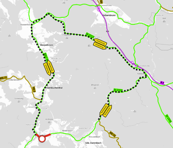 Die ausgeschilderte Umleitung erfolgt für beide Fahrtrichtungen über die Staatsstraße 2308, Hessenthal, Staatsstraße 2312, Rohrbrunn und die Staatsstraße 2317.