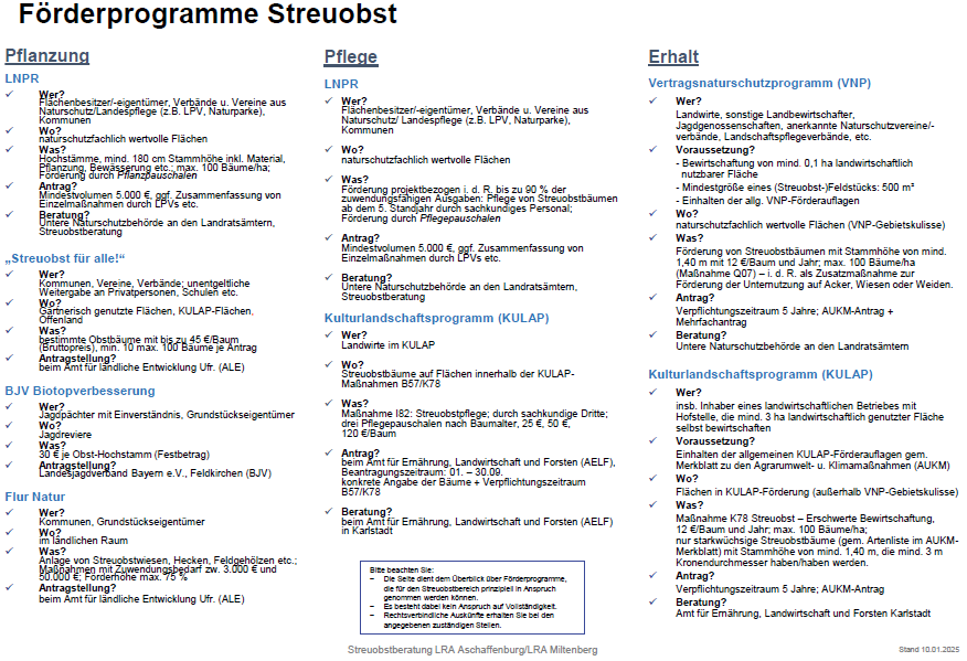 Im Rahmen des Streuobstpakts Bayern setzt sich der Freistaat für den Erhalt und die Pflege wertvoller Streuobstwiesen ein. Ziel ist es, diese artenreichen Kulturlandschaften zu schützen und ihre ökologische sowie kulturelle Bedeutung zu bewahren. Bürgerinnen und Bürger haben die Möglichkeit, Fördermittel für Pflanzungen und Pflegearbeiten zu beantragen.