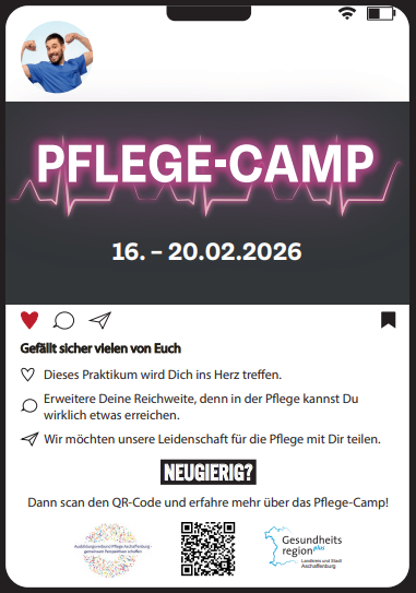 Die Gesundheitsregionplus organisiert in Kooperation mit dem Ausbildungsverbund Pflege eine einrichtungsübergreifende Praktikumswoche, das sogenannte Pflege-Camp. Das Praktikum findet vom 16.02. bis 20.02.2026 statt und bietet Dir Einblicke in die verschiedensten Arbeitsbereiche. Du wirst einen Tag Klinik-Luft schnuppern, eine Tour in der ambulanten Pflege begleiten und einen Tag im Pflegeheim miterleben. Außerdem wirst Du Infos zu Deinen Ausbildungs- und Karrierechancen in der Pflege bekommen und die Pflegeschulen kennenlernen. Wir freuen uns auf Deine Teilnahme!