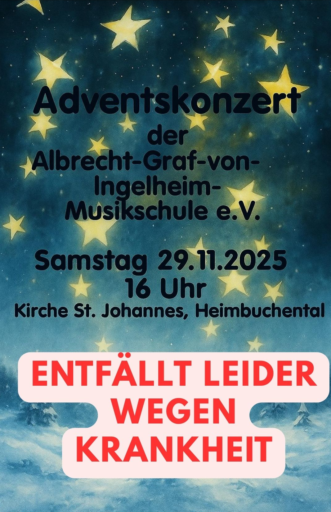 Am Samstag, 29.11.2025, laden wir wieder herzlich ein zum Weihnachtskonzert der Albrecht-Graf-von-Ingelheim-Musikschule in die St-Johannes-Kirche in Heimbuchenthal um 16 Uhr. Wir freuen uns auf Ihren Besuch!